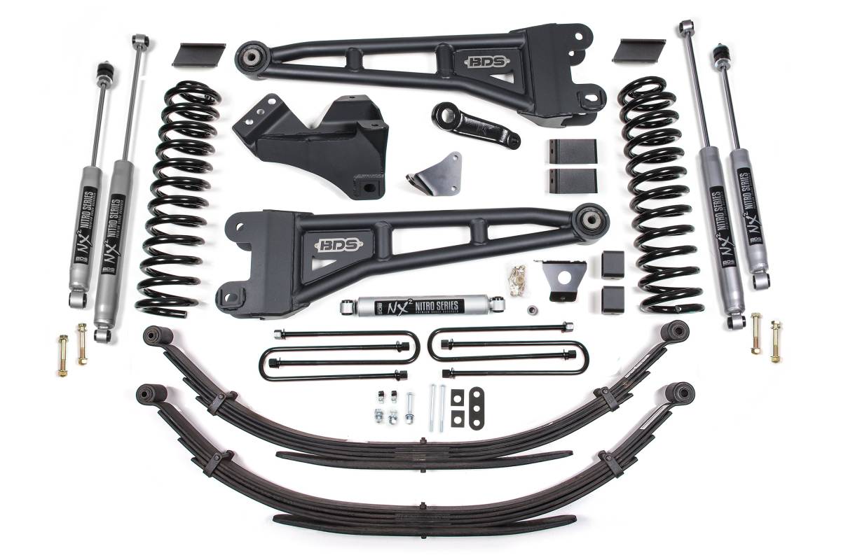 This 6-inch radius arm lift kit from BDS Suspension is designed for 2008–2010 Ford F250 and F350 Super Duty diesel trucks (4WD) and provides clearance for up to 37-inch tires. The front of the kit includes diesel-specific 6-inch lift Pro-Ride coil springs, heavy-duty tubular replacement radius arms, a forged drop pitman arm, track bar bracket for steering correction, sway bar relocation hardware, brake line brackets, and custom-tuned nitrogen charged shocks. The rear base kit includes high-strength steel lift blocks, longer U-bolts, and brake line brackets, with a choice of rear lift option and shock upgrade available at time of purchase.