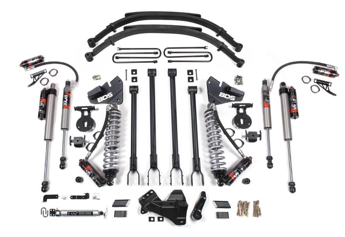 This 4-inch lift kit with 4-Link and FOX 2.5 Performance Elite coil-over conversion is designed for 2017–2019 Ford F-250/F-350 Super Duty diesel-powered 4WD trucks (SRW models only). The kit provides clearance for up to 37-inch tires and includes everything necessary for front and rear installation. Up front, the kit features diesel-specific FOX 2.5 coil-over shocks, 4-link control arms with conversion brackets, a forged drop pitman arm, a track bar bracket for steering correction, sway bar relocation, and brake line brackets. In the rear, the kit uses a high-strength fabricated lift block or optional leaf springs, longer u-bolts, brake line brackets, and a matching set of FOX Performance shocks.
