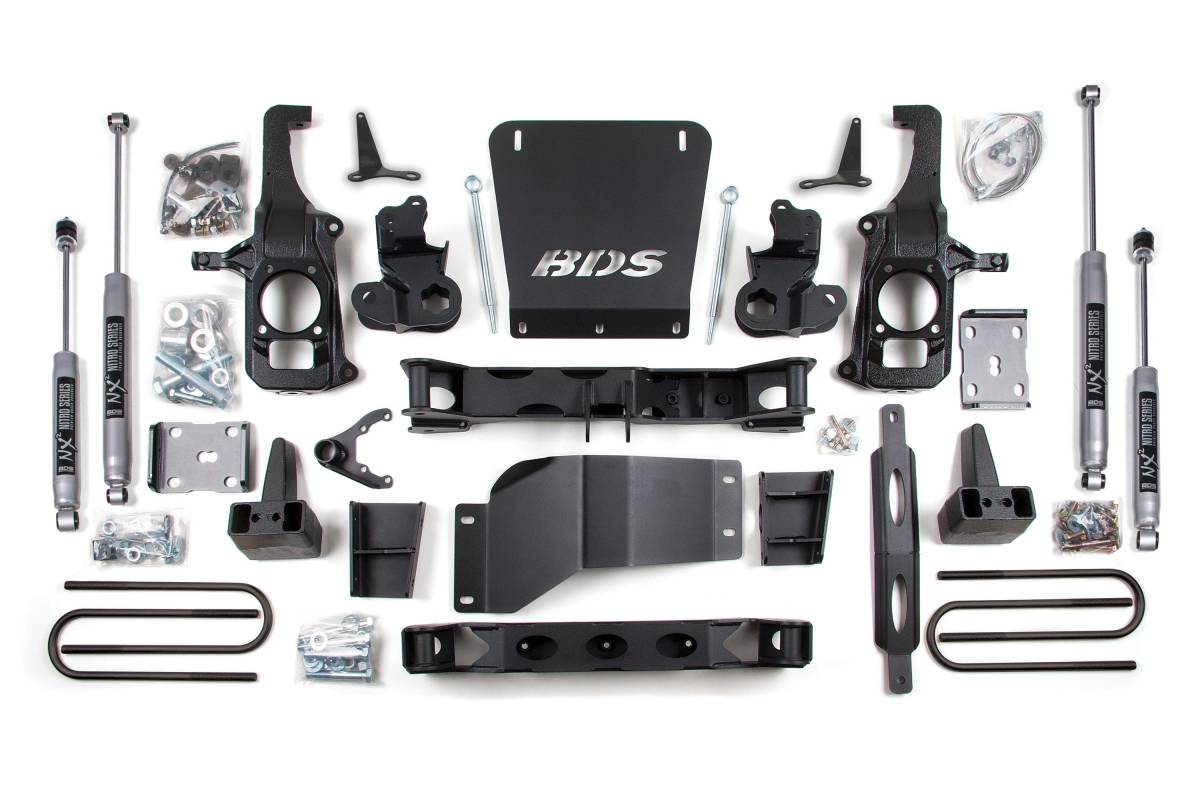 This BDS 6.5-inch lift kit is designed for the 2011–2019 Chevy Silverado and GMC Sierra 2500HD/3500 and provides increased ground clearance with fitment for tires up to 37 inches. The front end uses a No Torsion Bar Drop System, mounting the torsion bars directly to the top of the lower a-arm to eliminate the need to drop the torsion bar cross-member. High-clearance 1/4-inch thick laser-cut steel crossmembers and a multi-piece differential relocation bracket system secure the front axle while improving CV angles. CNC-machined ductile cast iron steering knuckles correct steering geometry at the new ride height and are designed to work with factory tie rod ends to maintain proper steering angles. A front skid plate system bolts together to form a rigid subframe for added underbody protection. In the rear, replacement lift blocks install in place of the stock block, retaining ride quality and load capacity. A u-bolt flip kit is also included on applicable configurations for maximum clearance.