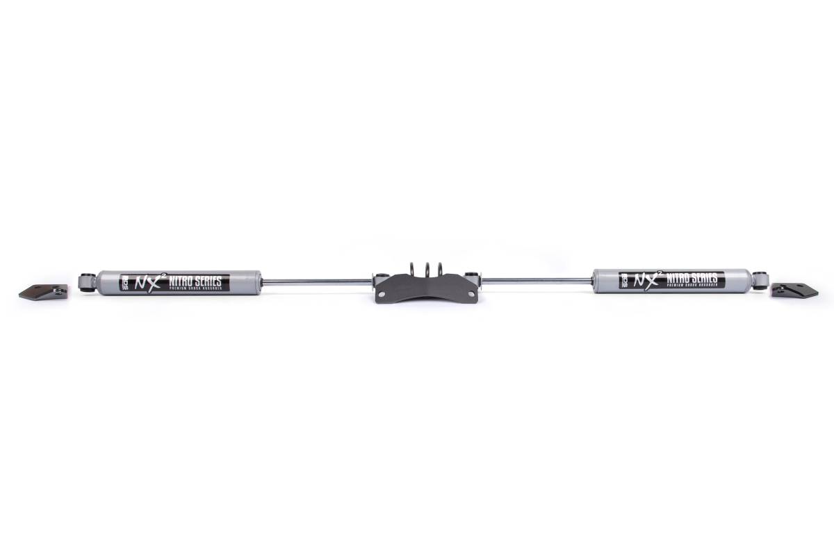 Enhance the handling of your 2006-2008 Dodge Ram 1500 Mega Cab 4WD by installing this BDS dual steering stabilizer mounting kit with NX2 shocks. Installing larger tires can exert additional force on your truck's suspension, but steering stabilizer shocks can effectively reduce bump steer and steering wheel feedback. BDS mounting brackets are constructed of high-strength steel and bolt on directly. When installed alongside a BDS lift kit, this steering stabilizer kit can help extend the lifespan of factory steering components.
