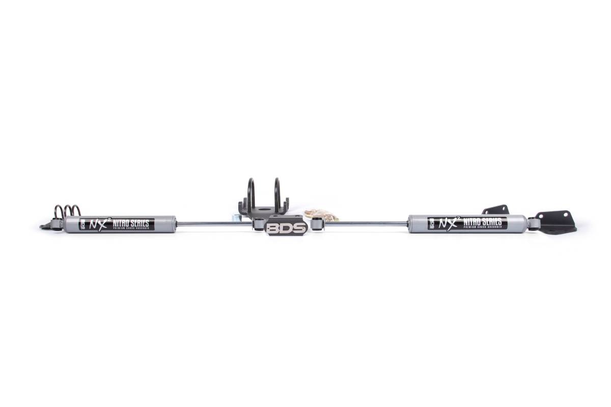 Enhance the handling of your 2009-2013 Dodge Ram 2500/3500 4WD by installing the BDS dual steering stabilizer mounting kit with NX2 shocks. Installing larger tires can exert additional force on your truck's suspension, but steering stabilizer shocks can effectively reduce bump steer and steering wheel feedback. BDS mounting brackets are constructed of high-strength steel and can be easily bolted on. When used alongside a BDS lift kit, this steering stabilizer kit can help extend the lifespan of your factory steering components.