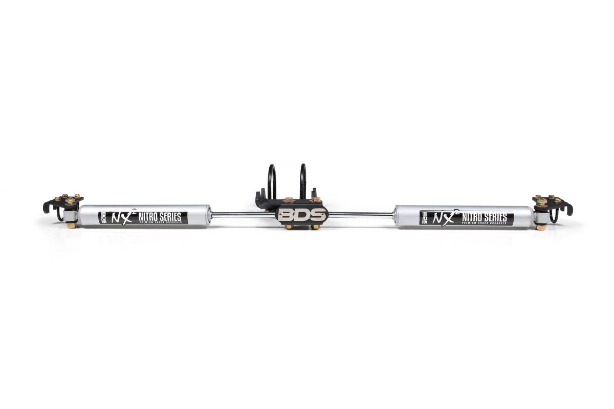 Enhance the handling of your 2005–2026 Ford F250 or F350 Super Duty 4WD with the BDS Dual Steering Stabilizer Kit. Installing larger tires can exert additional force on your truck's suspension; this kit's dual steering stabilizer shocks reduce bump steer and steering wheel feedback, helping to extend the lifespan of factory steering components. Heavy-duty mounting brackets are constructed of high-strength steel and bolt on easily. The included BDS NX2 stabilizer shocks feature a pressurized nitrogen-charged twin-tube design with 10-stage velocity-sensitive valving for fast dampening response across on- and off-road terrain. The 2-inch-bodied shocks use a large 1-3/8-inch fluon-banded piston, self-lubricating seals, and a 14mm hardened chrome shaft to resist rock chips and corrosion.