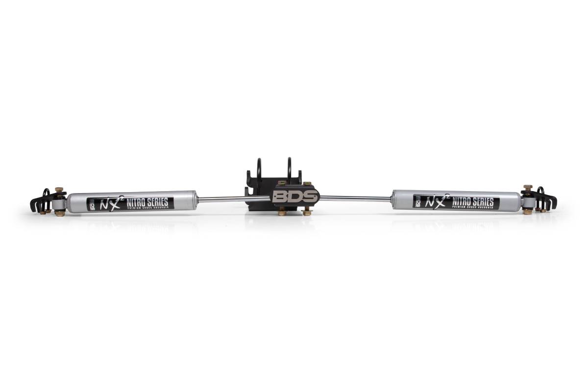The BDS Dual Steering Stabilizer Kit is engineered for 2005–2026 Ford F-250 and F-350 Super Duty 4WD trucks, accommodating stock height and lifts up to 2 inches. This dual stabilizer significantly reduces side-to-side tire motion, enhancing steering response, handling, and overall ride quality whether towing heavy loads or navigating off-road terrain.