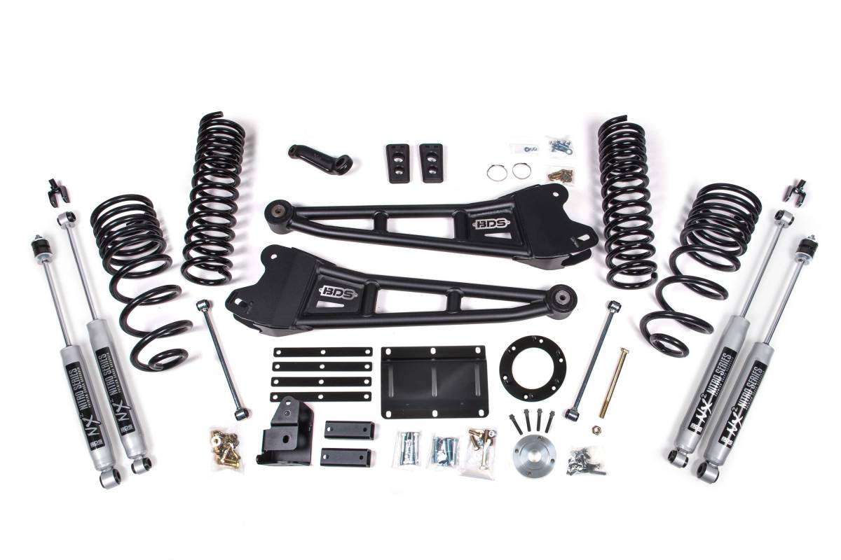 This 5.5-inch lift kit with radius arm from BDS Suspension is designed for 2014–2018 RAM 2500 gas-powered 4WD trucks. The kit is engineered to improve stance, performance, and capability while providing clearance for up to 37-inch tires. Up front, the kit includes gas-specific Pro-Ride coil springs, heavy-duty replacement radius arms, a forged drop pitman arm, track bar bracket for steering correction, bump stops, brake line brackets, and precision-tuned shocks. A transfer case indexing ring and new transmission crossmember are supplied to allow use of the factory front driveshaft at this lift height. In the rear, the kit uses progressive rate Pro-Ride coil springs, a track bar relocation bracket, bump stop extensions, sway bar links, and a matching set of shocks.