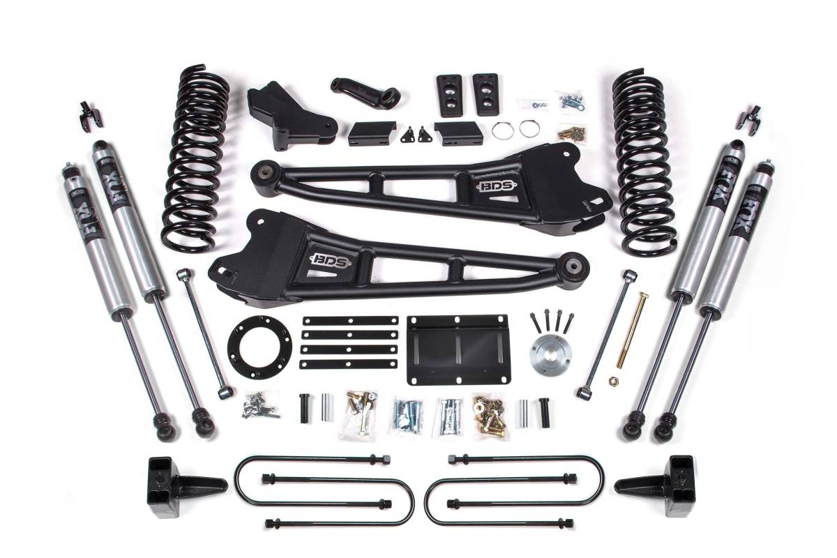 This 6-inch lift kit with radius arms is engineered by BDS Suspension for 2013–2018 Ram 3500 diesel-powered 4WD trucks. The kit is designed to improve stance, performance, and capability while providing clearance for up to 37-inch tires. Up front, the kit includes diesel-specific Pro-Ride coil springs, heavy duty tubular radius arms, a forged drop pitman arm, a track bar bracket for steering correction, bump stops, brake line brackets, and precision-tuned shocks. In the rear, the kit utilizes a high-strength fabricated lift block or leaf springs (depending on configuration), longer u-bolts, and a matching set of shocks.