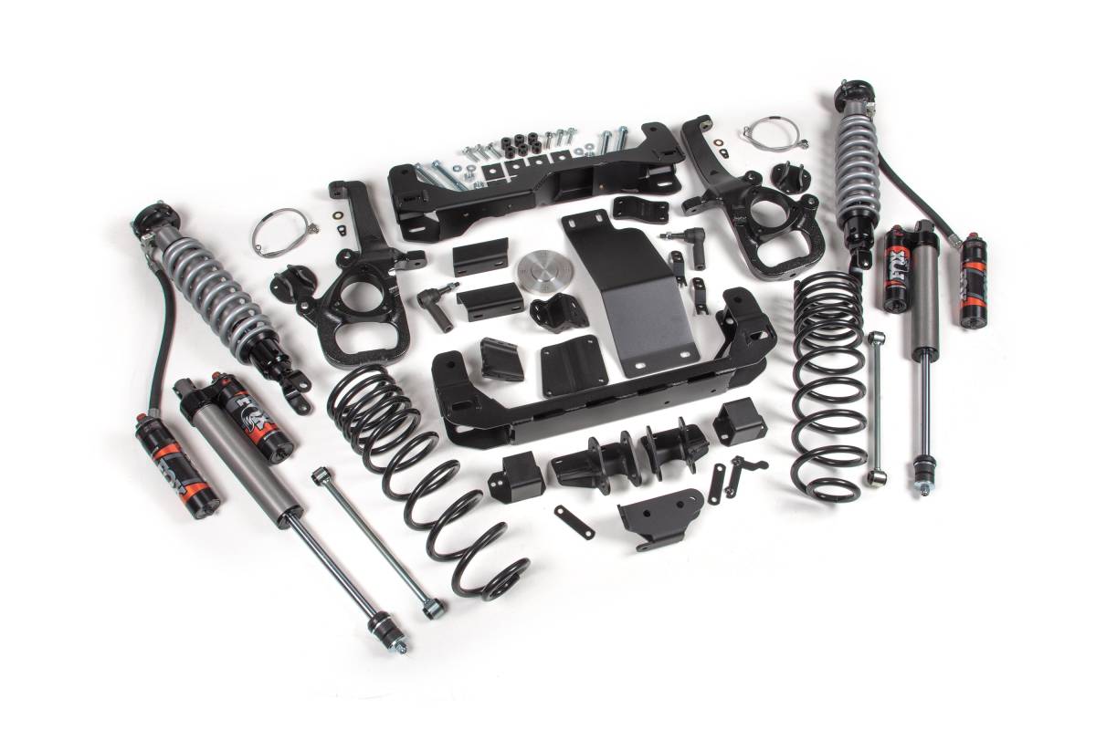 Up front, the kit utilizes FOX 2.5 Performance Elite coil-over shocks, high-arched 1/4-inch thick steel crossmembers, multipiece differential relocation brackets, and heavy-duty skid plates. CNC-machined ductile iron steering knuckles and replacement tie rod ends correct steering geometry at the lifted ride height and maintain ESC system compatibility. Sway bar drops, bump stop extensions, stainless steel braided brake lines, CV spacers, and all required hardware are also included.