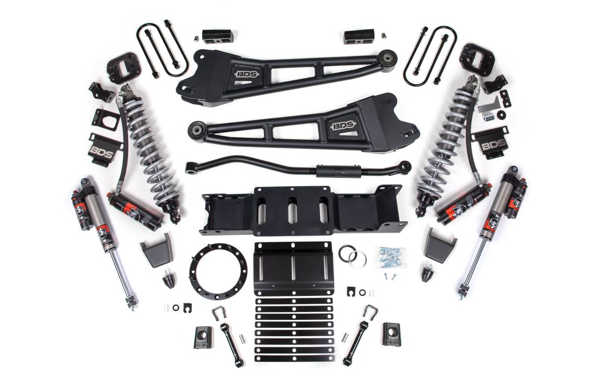 The BDS 3-Inch Radius Arm Lift Kit for 2019–2024 RAM 3500 4WD Diesel trucks replaces the factory suspension with a purpose-built performance system. Heavy-duty BDS radius arms improve articulation and provide rugged strength, while the included BDS Coilover Conversion Kit mounts FOX 2.5 Performance Elite coilovers in the factory coil spring bucket for precise damping and improved ride quality both on and off-road. FOX Performance Elite shocks are fitted at the rear to maintain control across varied terrain. A front adjustable track bar allows the front axle to be re-centered after lifting, and front sway bar correction hardware maintains handling performance.