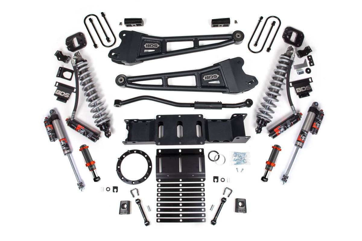 The BDS 3-Inch Radius Arm Lift Kit for 2019–2024 RAM 3500 4WD Diesel trucks replaces the factory suspension with a purpose-built performance system. Heavy-duty BDS radius arms improve articulation and provide rugged strength, while the included BDS Coilover Conversion Kit mounts FOX 2.5 Performance Elite coilovers in the factory coil spring bucket for precise damping and improved ride quality both on and off-road. FOX Performance Elite shocks are fitted at the rear to maintain control across varied terrain. A front adjustable track bar allows the front axle to be re-centered after lifting, and front sway bar correction hardware maintains handling performance.