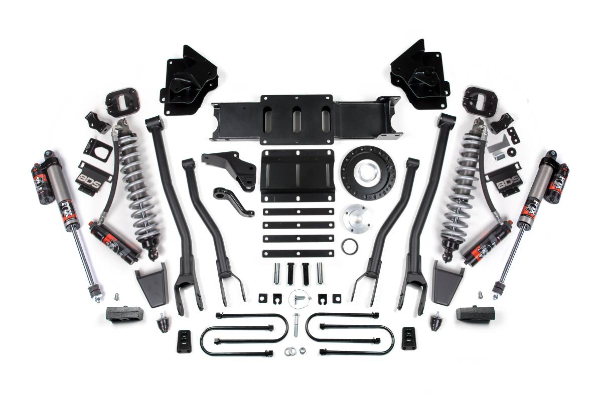 The BDS 4-inch 4-Link Lift Kit for 2013–2018 Ram 3500 4WD Diesel trucks replaces the factory suspension with a purpose-built system designed for increased articulation, strength, and off-road capability. The kit centers on heavy-duty BDS 4-Link arms paired with a front coilover conversion featuring FOX 2.5 Performance Elite coilovers, delivering improved damping control and ride quality on and off the road. FOX 2.5 Performance Elite shocks are fitted at the rear. An optional FOX 2.0 Hydraulic Bump Stop upgrade is available for the front to provide an additional layer of impact absorption at full suspension travel.