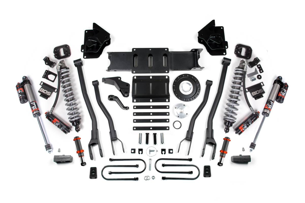 The BDS 4-inch 4-Link Lift Kit for 2013–2018 Ram 3500 4WD Diesel trucks replaces the factory suspension with a purpose-built system designed for increased articulation, strength, and off-road capability. The kit centers on heavy-duty BDS 4-Link arms paired with a front coilover conversion featuring FOX 2.5 Performance Elite coilovers, delivering improved damping control and ride quality on and off the road. FOX 2.5 Performance Elite shocks are fitted at the rear. An optional FOX 2.0 Hydraulic Bump Stop upgrade is available for the front to provide an additional layer of impact absorption at full suspension travel.