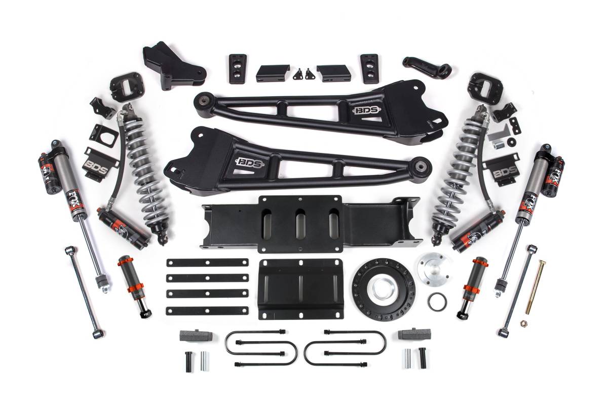 The BDS 4-inch Radius Arm Lift Kit for 2013–2018 Ram 3500 4WD Diesel trucks replaces the factory suspension with heavy-duty components designed for strength and performance. Heavy-duty BDS radius arms improve articulation and durability, while the BDS Coilover Conversion Kit pairs with FOX 2.5 Performance Elite coilovers up front for enhanced damping control and ride quality on and off the road. FOX Performance Elite shocks are fitted at the rear to maintain composure over demanding terrain. An optional FOX 2.0 Hydraulic Bump Stop is available for the front to manage high-impact situations and protect components at the limits of suspension travel.