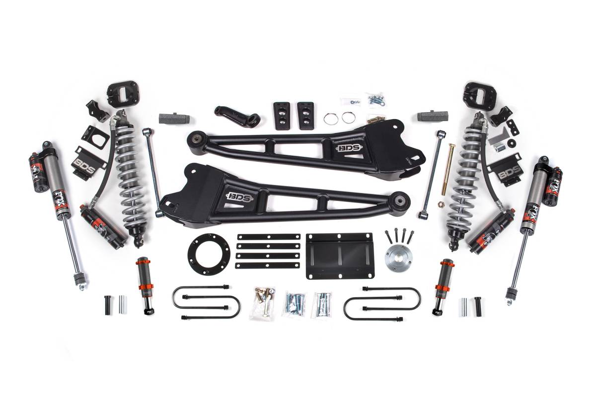 The BDS 6-inch Radius Arm Lift Kit for the Ram 3500 (2013–2018) 4WD Diesel replaces the factory front suspension with a full coilover conversion using FOX 2.5 Performance Elite coilovers, mounted in the factory coil spring bucket. Heavy-duty tubular steel radius arms correct caster while maximizing ground clearance. FOX 2.5 Performance Elite rear shocks are included. An optional FOX 2.0 hydraulic bump stop upgrade for the front is available to provide additional control when utilizing full suspension travel over rough terrain at speed. Rear lift is available via a block kit or multi-leaf progressive leaf springs, and transfer case indexing ring kits are available in 6-bolt and 8-bolt configurations to accommodate different Ram 3500 transmission options.