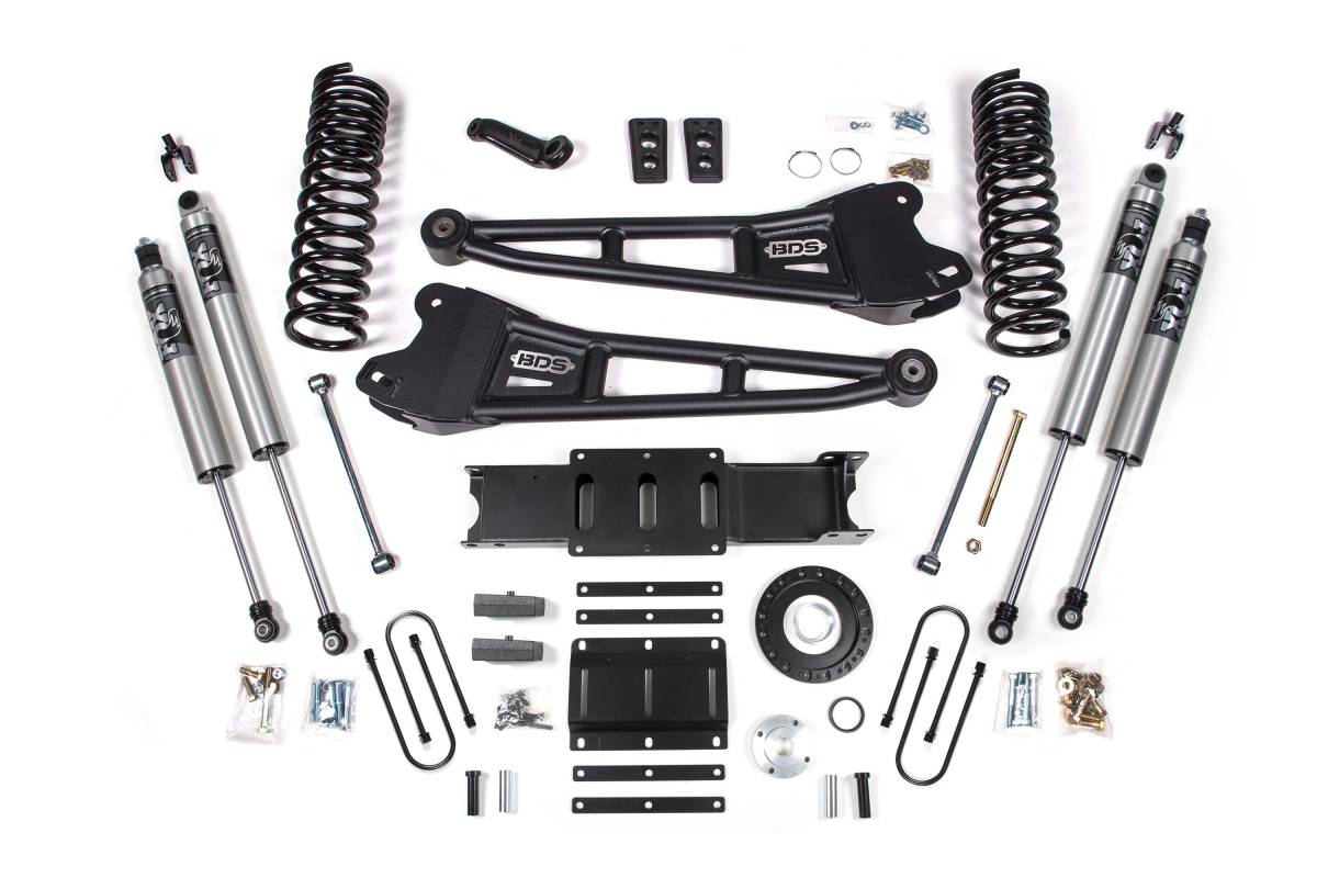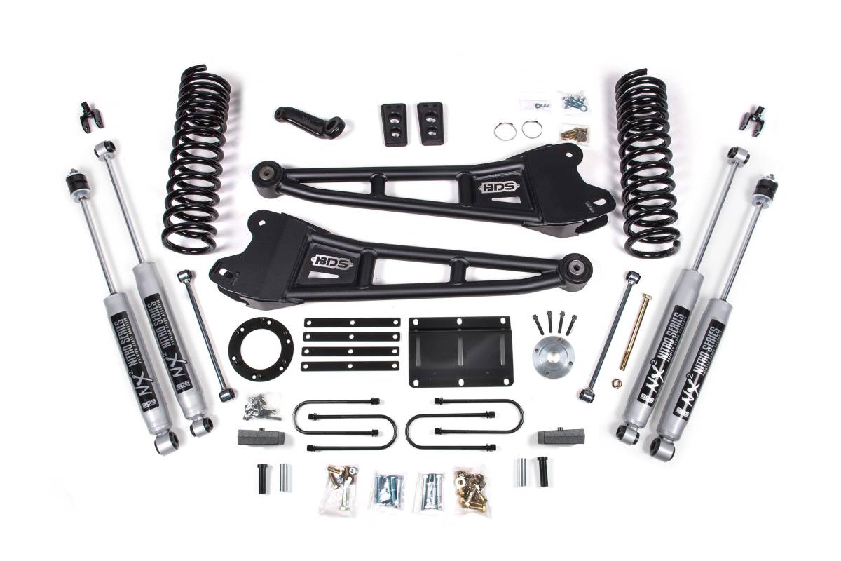 This 6-inch lift kit with radius arms is engineered by BDS Suspension for 2013–2018 Ram 3500 diesel-powered 4WD trucks. The kit is designed to improve stance, performance, and capability while providing clearance for up to 37-inch tires. Up front, the kit includes diesel-specific Pro-Ride coil springs, heavy duty tubular radius arms, a forged drop pitman arm, a track bar bracket for steering correction, bump stops, brake line brackets, and precision-tuned shocks. In the rear, the kit utilizes a high-strength fabricated lift block or leaf springs (depending on configuration), longer u-bolts, and a matching set of shocks.