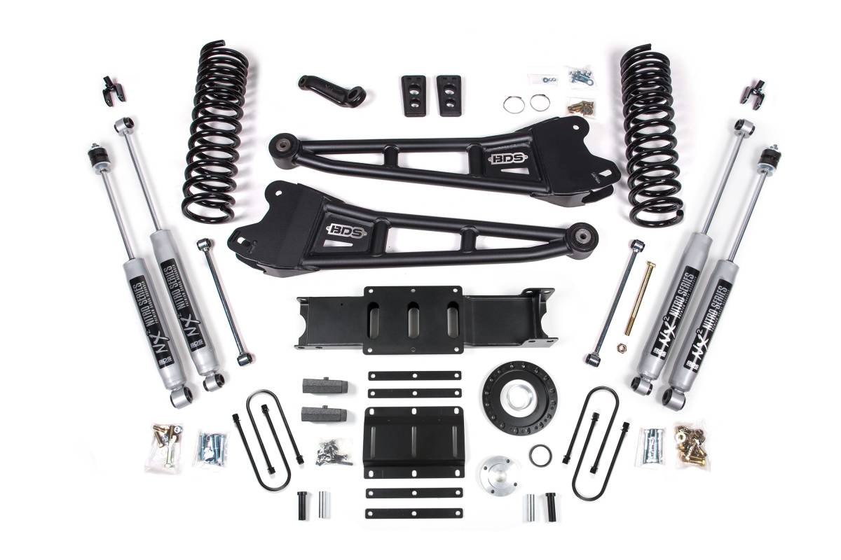 This 6-inch lift kit with radius arms is engineered by BDS Suspension for 2013–2018 Ram 3500 diesel-powered 4WD trucks. The kit is designed to improve stance, performance, and capability while providing clearance for up to 37-inch tires. Up front, the kit includes diesel-specific Pro-Ride coil springs, heavy duty tubular radius arms, a forged drop pitman arm, a track bar bracket for steering correction, bump stops, brake line brackets, and precision-tuned shocks. In the rear, the kit utilizes a high-strength fabricated lift block or leaf springs (depending on configuration), longer u-bolts, and a matching set of shocks.