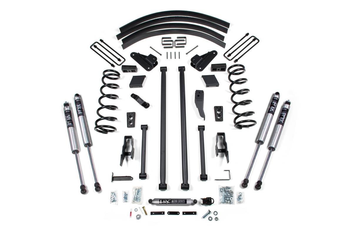 The long lower control arms are built to reduce caster change through wheel travel, creating a more controlled feeling at the steering wheel. This 4-Link long arm system retains the factory triangulation of the arms, adding stability to the suspension system. Up front, the kit includes diesel-specific Pro-Ride coil springs, all four control arms plus mounting bracket, a forged drop pitman arm and track bar bracket for steering correction, bump stops, sway bar drop brackets, and precision-tuned shocks. In the rear, the kit utilizes heavy duty cast steel blocks and add-a-leaf combo (or rear leaf springs, depending on configuration), longer u-bolts, and a matched set of shocks.