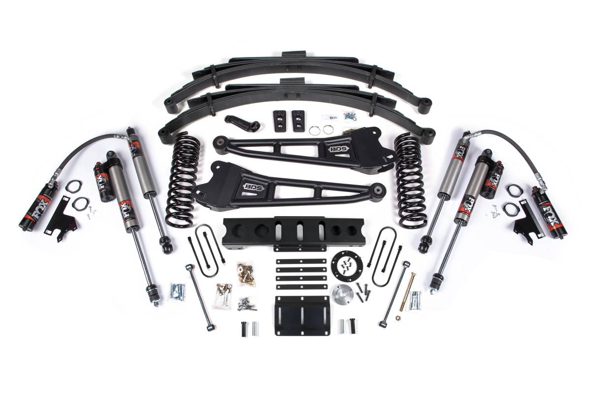 This 6-inch lift kit with radius arms is engineered by BDS Suspension for 2013–2018 Ram 3500 diesel-powered 4WD trucks. The kit is designed to improve stance, performance, and capability while providing clearance for up to 37-inch tires. Up front, the kit includes diesel-specific Pro-Ride coil springs, heavy duty tubular radius arms, a forged drop pitman arm, a track bar bracket for steering correction, bump stops, brake line brackets, and precision-tuned shocks. In the rear, the kit utilizes a high-strength fabricated lift block or leaf springs (depending on configuration), longer u-bolts, and a matching set of shocks.