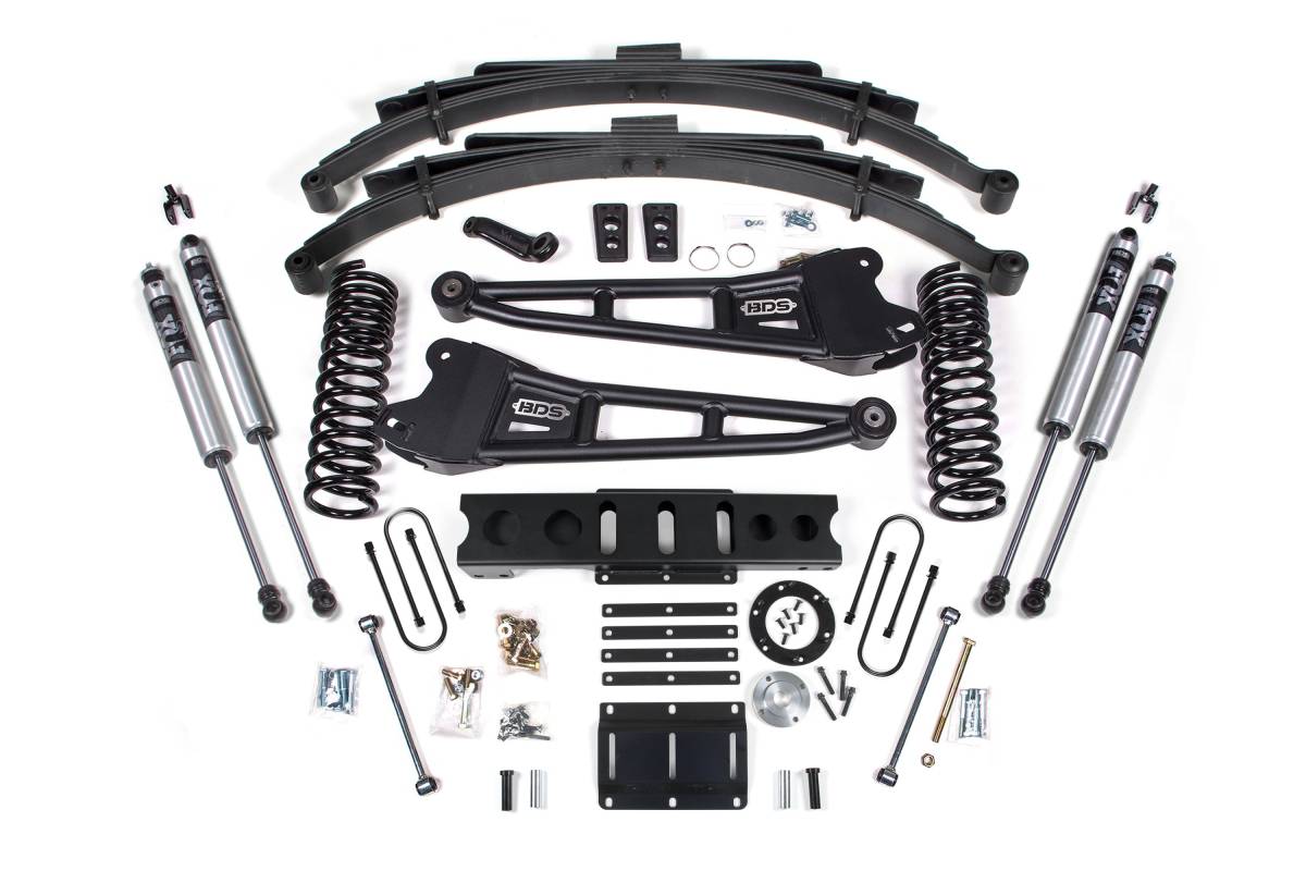 This 6-inch lift kit with radius arms is engineered by BDS Suspension for 2013–2018 Ram 3500 diesel-powered 4WD trucks. The kit is designed to improve stance, performance, and capability while providing clearance for up to 37-inch tires. Up front, the kit includes diesel-specific Pro-Ride coil springs, heavy duty tubular radius arms, a forged drop pitman arm, a track bar bracket for steering correction, bump stops, brake line brackets, and precision-tuned shocks. In the rear, the kit utilizes a high-strength fabricated lift block or leaf springs (depending on configuration), longer u-bolts, and a matching set of shocks.