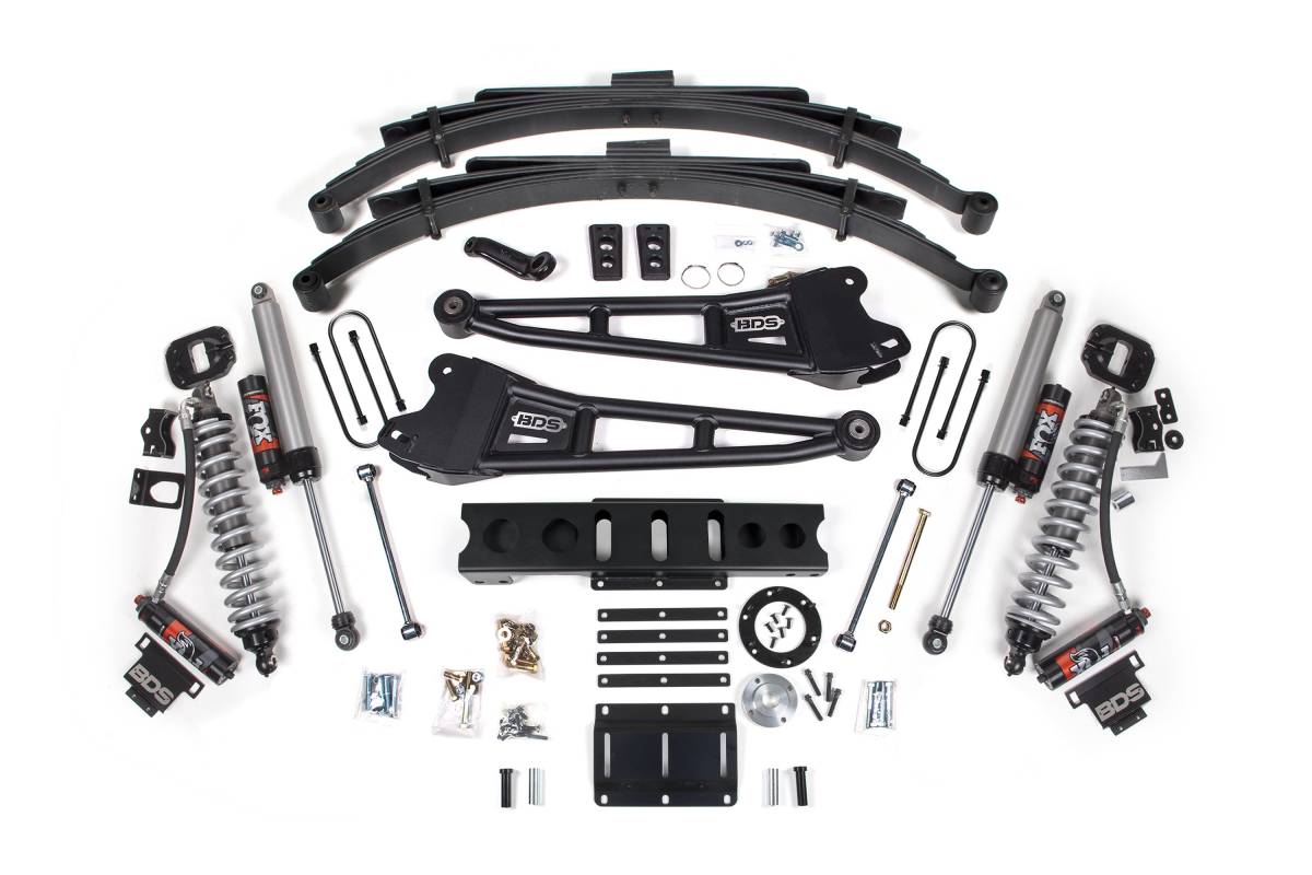 The BDS 6-inch Radius Arm Lift Kit for the Ram 3500 (2013–2018) 4WD Diesel replaces the factory front suspension with a full coilover conversion using FOX 2.5 Performance Elite coilovers, mounted in the factory coil spring bucket. Heavy-duty tubular steel radius arms correct caster while maximizing ground clearance. FOX 2.5 Performance Elite rear shocks are included. An optional FOX 2.0 hydraulic bump stop upgrade for the front is available to provide additional control when utilizing full suspension travel over rough terrain at speed. Rear lift is available via a block kit or multi-leaf progressive leaf springs, and transfer case indexing ring kits are available in 6-bolt and 8-bolt configurations to accommodate different Ram 3500 transmission options.