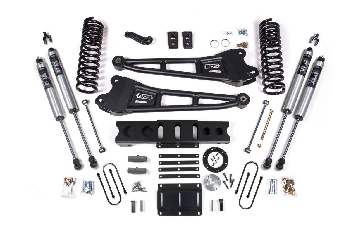 This 6-inch lift kit with radius arms is engineered by BDS Suspension for 2013–2018 Ram 3500 diesel-powered 4WD trucks. The kit is designed to improve stance, performance, and capability while providing clearance for up to 37-inch tires. Up front, the kit includes diesel-specific Pro-Ride coil springs, heavy duty tubular radius arms, a forged drop pitman arm, a track bar bracket for steering correction, bump stops, brake line brackets, and precision-tuned shocks. In the rear, the kit utilizes a high-strength fabricated lift block or leaf springs (depending on configuration), longer u-bolts, and a matching set of shocks.
