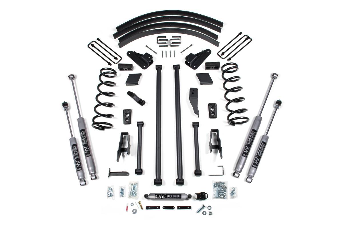 This configuration includes a rear block kit designed for trucks with factory top-mounted overload springs, paired with NX2 Nitro Series shocks. The rear steel lift blocks are engineered for correct pinion angles, eliminate the need for additional lift blocks, and reduce axle wrap. NX2 shocks feature a nitrogen-charged twin-tube design, 10-stage velocity-sensitive valving, dual-welded ends, a 1-3/8-inch high-flow piston, self-lubricating seals, and a silver powder coat finish.