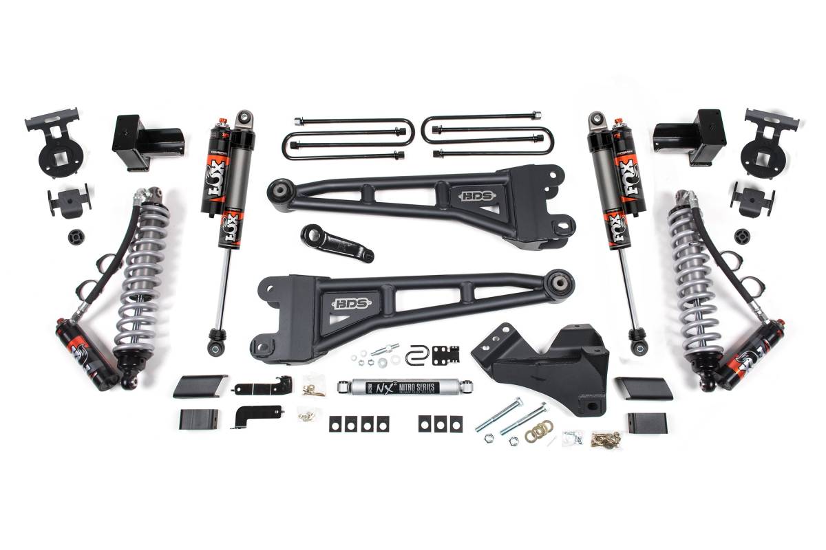 Upgrade your 2023–2026 Ford F250/F350 Super Duty diesel-powered truck with this 5-inch radius arm lift kit featuring a FOX 2.5 Performance Elite Coilover conversion from BDS Suspension. Designed to improve stance, performance, and capability, this kit includes everything necessary to set your truck up with clearance for up to 37-inch tires. Up front, the lift kit includes diesel-specific FOX 2.5 coilover shocks, heavy duty replacement radius arms, a forged drop pitman arm, a track bar bracket for steering correction, sway bar relocation, and brake line brackets. In the rear, the kit utilizes a high-strength fabricated lift block, longer u-bolts, brake line brackets, and a matching set of FOX Performance shocks.