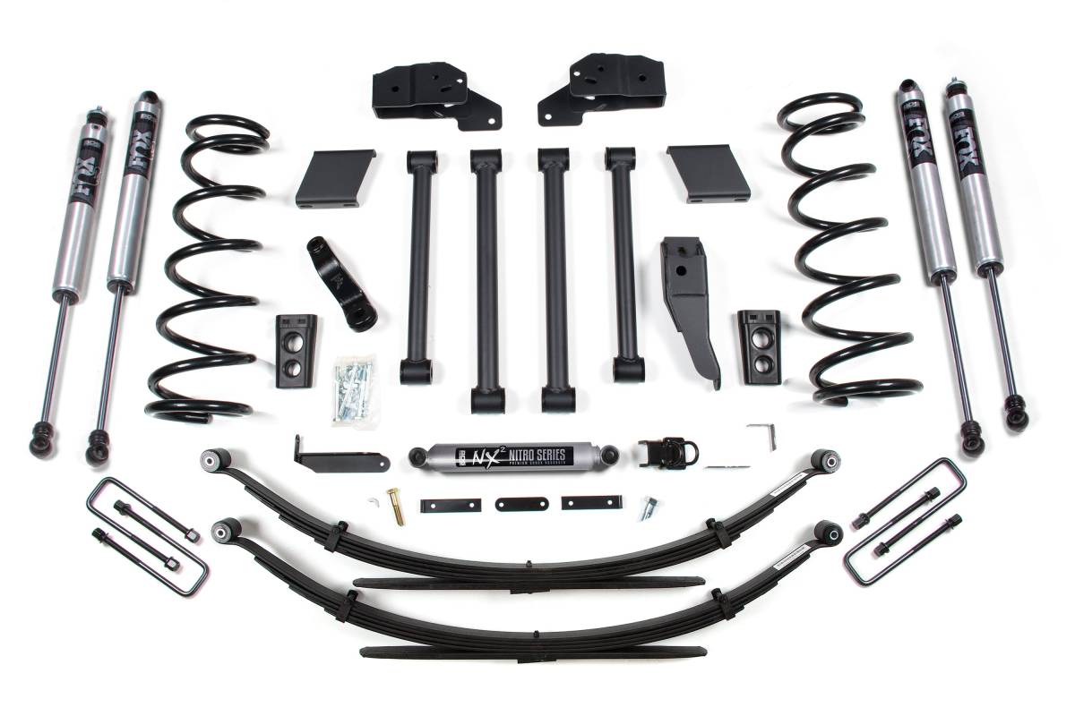 Up front, the kit includes Pro-Ride coil springs, all four control arms plus relocation bracket, a forged drop pitman arm, a track bar bracket for steering correction, bump stops, and sway bar drop brackets. In the rear, the kit utilizes either a heavy duty cast steel block and add-a-leaf combination or replacement leaf springs, longer U-bolts, and a matched set of shocks. Shock options are NX2 Nitro Series or FOX 2.0 Performance Series.