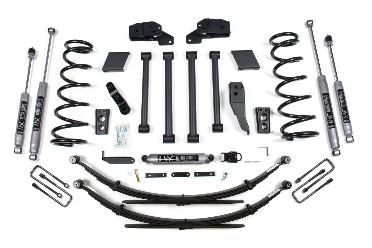 Up front, the kit includes Pro-Ride coil springs, all four control arms plus relocation bracket, a forged drop pitman arm, a track bar bracket for steering correction, bump stops, and sway bar drop brackets. In the rear, the kit utilizes either a heavy duty cast steel block and add-a-leaf combination or replacement leaf springs, longer U-bolts, and a matched set of shocks. Shock options are NX2 Nitro Series or FOX 2.0 Performance Series.