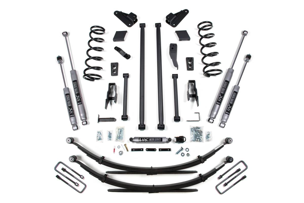 Up front, the kit includes diesel-specific Pro-Ride coil springs, all four control arms plus mounting bracket, a forged drop pitman arm, track bar bracket for steering correction, bump stops, sway bar drop brackets, and precision-tuned shocks. In the rear, the kit utilizes heavy duty cast steel blocks and add-a-leaf combo (or leaf springs depending on variant selection), longer u-bolts, and a matching set of shocks.