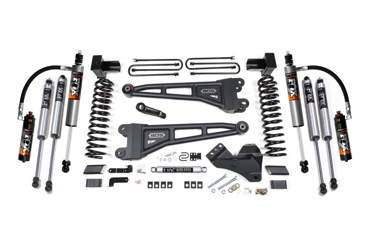 This 5-inch radius arm lift kit from BDS Suspension is designed for 2023–2026 Ford F-250/F-350 Super Duty 4WD gas trucks. The kit improves stance, performance, and off-road capability while providing clearance for up to 37-inch tires. Up front, the kit includes gas-specific Pro-Ride coil springs, heavy-duty tubular replacement radius arms, a forged drop pitman arm, a track bar bracket for steering correction, sway bar relocation hardware, brake line brackets, and precision-tuned nitrogen-charged shocks. The rear is lifted using either a high-strength fabricated lift block or leaf springs, along with longer U-bolts, brake line brackets, and a matched set of shocks in your choice of configuration.
