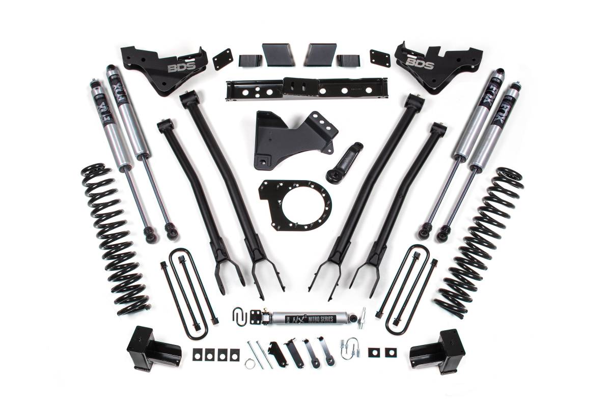 This 7-inch 4-Link lift kit from BDS Suspension is engineered for 2023–2026 Ford F-250/F-350 Super Duty diesel trucks. The kit provides clearance for tires up to 38 inches and includes all components necessary for a complete installation. Up front, the kit features diesel-specific Pro-Ride coil springs, a 4-Link control arm conversion, a forged drop pitman arm and track bar bracket for steering correction, sway bar relocation, brake line brackets, and custom-tuned nitrogen charged shocks. A transfer case indexing ring with ARP studs and a high-clearance transmission crossmember are included to allow use of the factory front driveshaft at this lift height. The rear of the kit is available with either a high-strength fabricated lift block or replacement leaf springs, along with longer u-bolts, brake line brackets, and a matched set of shocks.