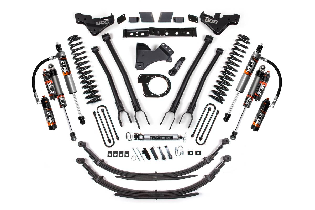 This 7-inch 4-Link lift kit from BDS Suspension is engineered for 2023–2026 Ford F-250/F-350 Super Duty diesel trucks. The kit provides clearance for tires up to 38 inches and includes all components necessary for a complete installation. Up front, the kit features diesel-specific Pro-Ride coil springs, a 4-Link control arm conversion, a forged drop pitman arm and track bar bracket for steering correction, sway bar relocation, brake line brackets, and custom-tuned nitrogen charged shocks. A transfer case indexing ring with ARP studs and a high-clearance transmission crossmember are included to allow use of the factory front driveshaft at this lift height. The rear of the kit is available with either a high-strength fabricated lift block or replacement leaf springs, along with longer u-bolts, brake line brackets, and a matched set of shocks.