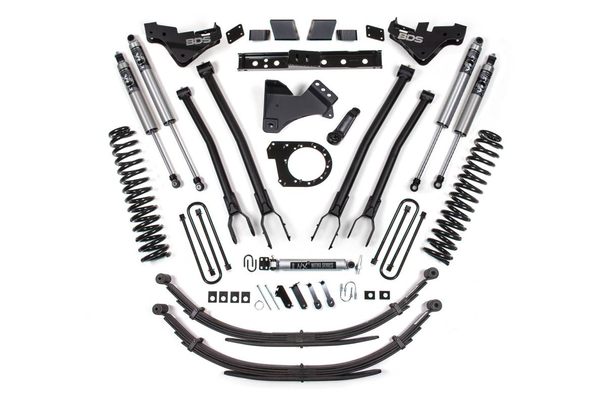 This 7-inch 4-Link lift kit from BDS Suspension is engineered for 2023–2026 Ford F-250/F-350 Super Duty diesel trucks. The kit provides clearance for tires up to 38 inches and includes all components necessary for a complete installation. Up front, the kit features diesel-specific Pro-Ride coil springs, a 4-Link control arm conversion, a forged drop pitman arm and track bar bracket for steering correction, sway bar relocation, brake line brackets, and custom-tuned nitrogen charged shocks. A transfer case indexing ring with ARP studs and a high-clearance transmission crossmember are included to allow use of the factory front driveshaft at this lift height. The rear of the kit is available with either a high-strength fabricated lift block or replacement leaf springs, along with longer u-bolts, brake line brackets, and a matched set of shocks.