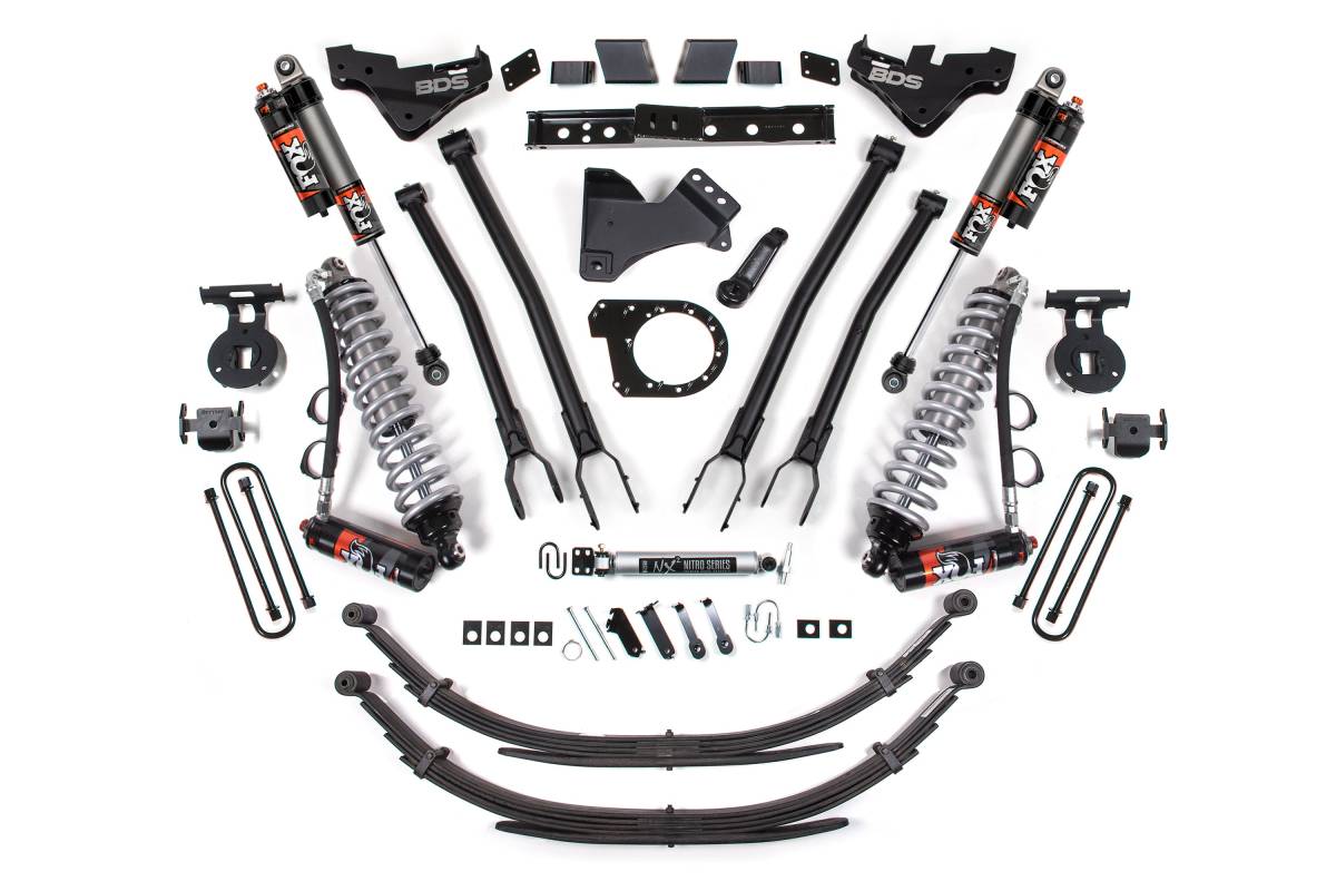 This 7-inch 4-Link lift kit with FOX 2.5 Performance Elite coilover conversion from BDS Suspension is engineered for 2023–2026 Ford F-250/F-350 Super Duty diesel trucks. The kit is designed to improve stance, performance, and off-road capability while providing clearance for tires up to 38 inches. Up front, the kit includes FOX 2.5 coilover shocks and mounting brackets, a 4-Link control arm conversion, a forged drop pitman arm and track bar bracket for steering correction, sway bar relocation, and brake line brackets. At this lift height, a transfer case indexing ring and new transmission crossmember are included to allow continued use of the factory front driveshaft. Rear components include brake line brackets, longer U-bolts, and a matching set of FOX Performance shocks, with the rear lift option varying by selected variant.