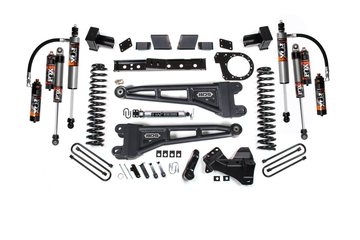 This 7-inch radius arm lift kit from BDS Suspension is designed for 2023–2026 Ford F-250/F-350 Super Duty diesel 4WD trucks. The kit provides clearance for up to 38-inch tires and includes all components necessary for a complete installation. Up front, the kit features diesel-specific Pro-Ride coil springs, heavy-duty replacement radius arms, a forged drop pitman arm, track bar bracket for steering correction, sway bar relocation, brake line brackets, and custom-tuned nitrogen charged shocks. A transfer case indexing ring and new transmission crossmember are included to allow use of the factory front driveshaft at this lift height. Rear lift is achieved through either a high-strength fabricated lift block with longer U-bolts and brake line brackets, or replacement leaf springs, depending on the selected variant.