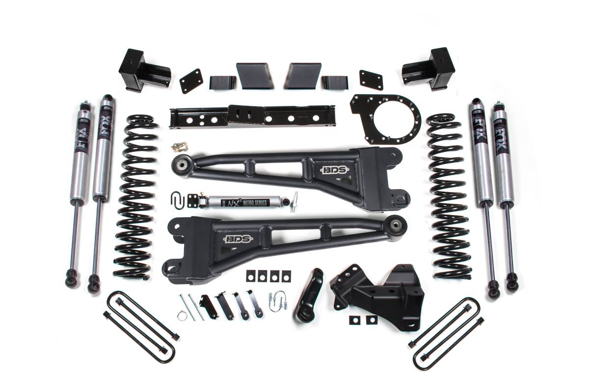 This 7-inch radius arm lift kit from BDS Suspension is designed for 2023–2026 Ford F-250/F-350 Super Duty diesel 4WD trucks. The kit provides clearance for up to 38-inch tires and includes all components necessary for a complete installation. Up front, the kit features diesel-specific Pro-Ride coil springs, heavy-duty replacement radius arms, a forged drop pitman arm, track bar bracket for steering correction, sway bar relocation, brake line brackets, and custom-tuned nitrogen charged shocks. A transfer case indexing ring and new transmission crossmember are included to allow use of the factory front driveshaft at this lift height. Rear lift is achieved through either a high-strength fabricated lift block with longer U-bolts and brake line brackets, or replacement leaf springs, depending on the selected variant.