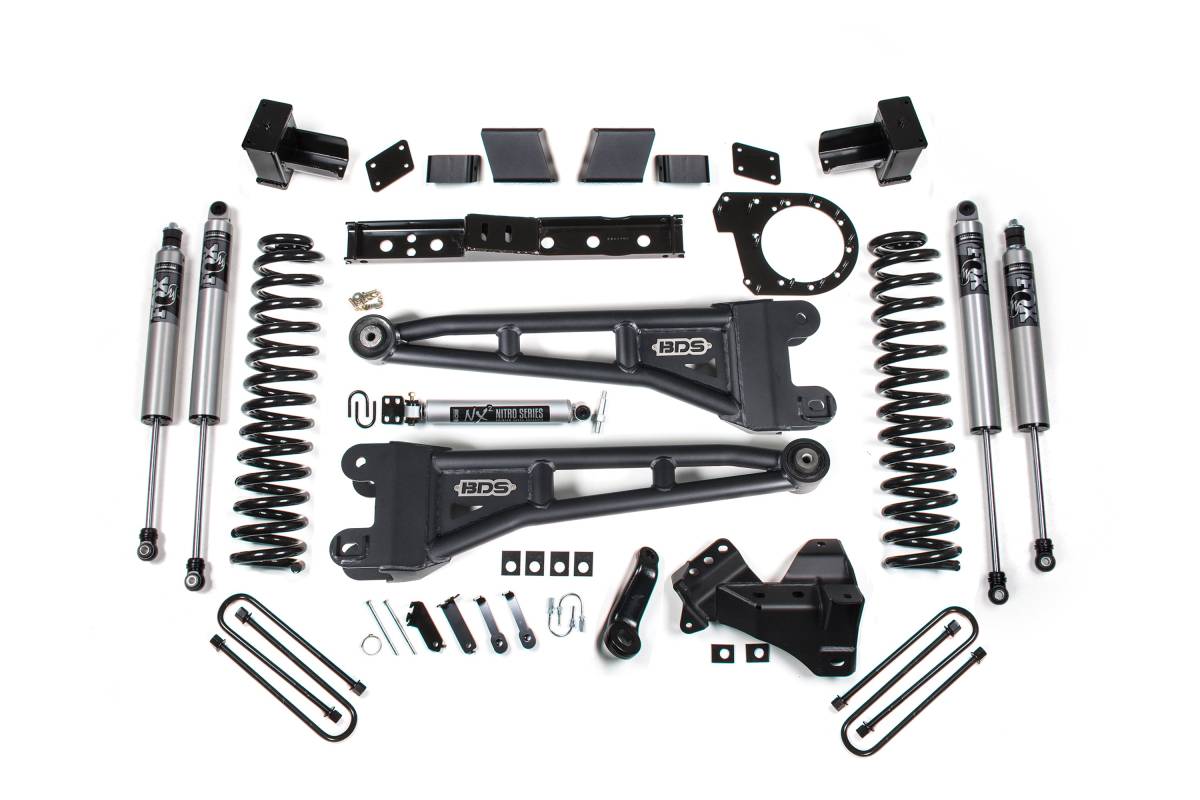 This 7-inch radius arm lift kit from BDS Suspension is designed for 2023–2026 Ford F-250/F-350 Super Duty diesel 4WD trucks. The kit provides clearance for up to 38-inch tires and includes all components necessary for a complete installation. Up front, the kit features diesel-specific Pro-Ride coil springs, heavy-duty replacement radius arms, a forged drop pitman arm, track bar bracket for steering correction, sway bar relocation, brake line brackets, and custom-tuned nitrogen charged shocks. A transfer case indexing ring and new transmission crossmember are included to allow use of the factory front driveshaft at this lift height. Rear lift is achieved through either a high-strength fabricated lift block with longer U-bolts and brake line brackets, or replacement leaf springs, depending on the selected variant.