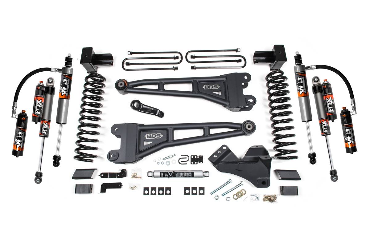 This 5-inch radius arm lift kit from BDS Suspension is designed for the Ford F350 Super Duty Dual Rear Wheel (DRW) diesel truck (2023–2026, 4WD). The kit improves stance, ride performance, and off-road capability, providing clearance for up to 37-inch tires. Up front, the kit includes diesel-specific Pro-Ride coil springs, heavy-duty replacement radius arms, a forged drop pitman arm, a track bar bracket for steering correction, sway bar relocation, brake line brackets, and precision-tuned nitrogen-charged shocks. In the rear, the kit utilizes a high-strength fabricated lift block, longer U-bolts, brake line brackets, and a matching set of shocks.