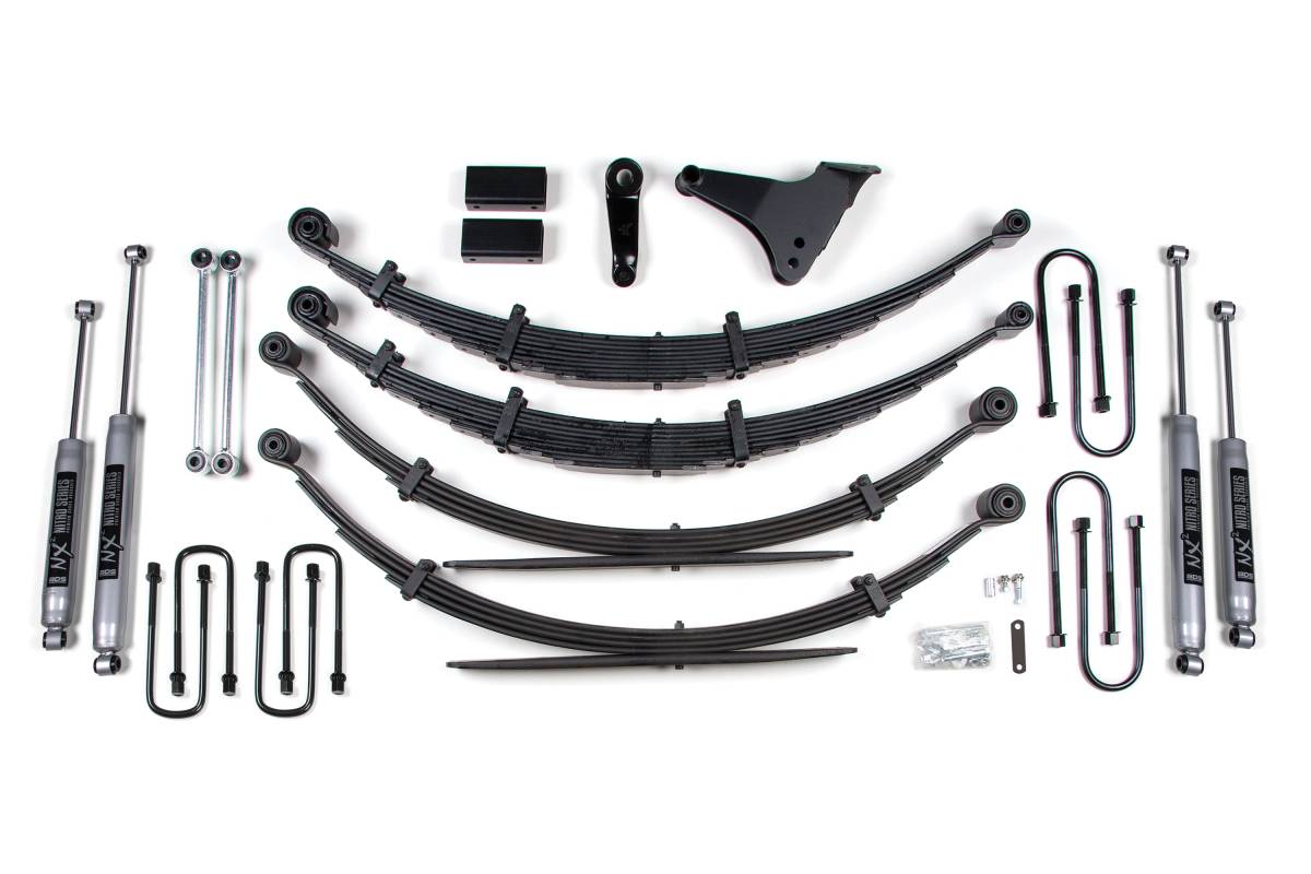 Configured with Square front U-bolts for vehicles manufactured prior to 2-28-99 (requires a different box kit due to factory track bar change), optional replacement rear Glide-Ride leaf spring packs in place of the standard block kit, and NX2 Nitro Series shocks. Rear leaf springs use a multi-leaf progressive design, maintain factory payload weight ratings, and eliminate the need for a lift block. NX2 shocks feature a nitrogen-charged twin-tube design, 10-stage velocity-sensitive valving, dual-welded ends, a 1-3/8-inch high-flow piston, self-lubricating seals, and a silver powder coat finish.