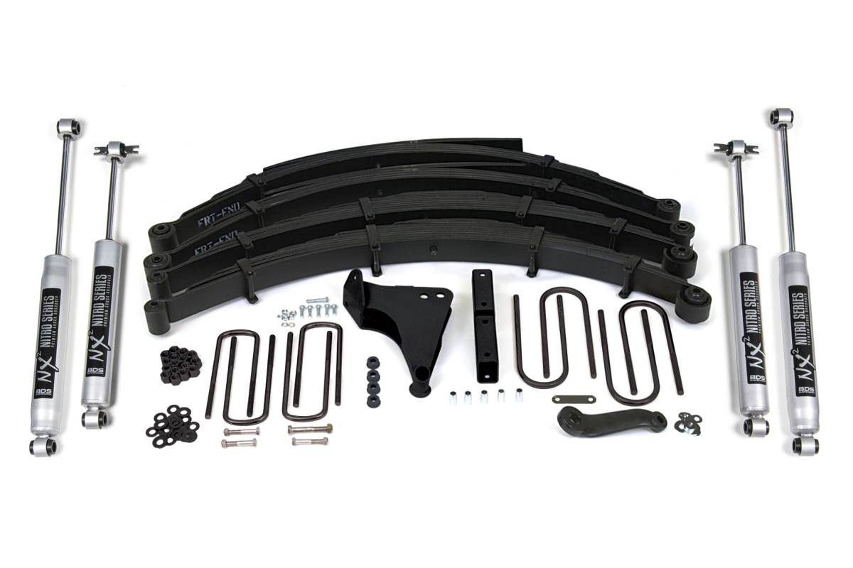 This 8-inch lift kit from BDS Suspension is designed for 1999–2004 Ford F250 and F350 Super Duty 4WD trucks, providing improved stance, performance, and capability with clearance for up to 38-inch tires. Up front, the kit includes Glide-Ride leaf springs, a forged drop pitman arm, a track bar bracket for steering correction, sway bar links, bump stop brackets, and precision-tuned nitrogen-charged shocks. In the rear, the kit utilizes replacement Glide-Ride full leaf spring packs, U-bolts, and a matching set of shocks.