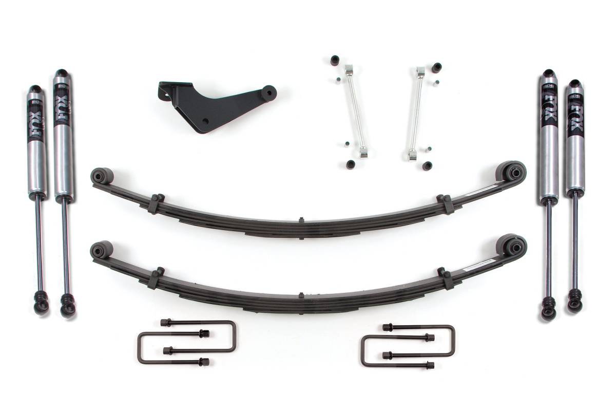 Designed for vehicles with square front U-bolts (typically 1999–2000 model years). Paired with FOX 2.0 Performance Series shocks featuring a 2-inch impact extruded aluminum body, internal floating piston (IFP) monotube design, CNC machined 6061-T6 aluminum mounting ends, a massive 5/8-inch hard chrome plated heat-treated alloy steel shaft, race-developed high-flow piston, application-specific valving, and a long-lasting clear anodized finish.