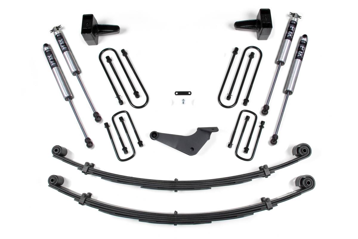 Configured for trucks with radius front U-bolts (typically 2001–2004; note sway bar links are not included with radius U-bolt kits) and with a factory rear overload leaf spring. Includes FOX 2.0 Performance Series shocks front and rear — featuring a 2-inch impact extruded aluminum body, internal floating piston (IFP) monotube design, CNC machined 6061-T6 aluminum mounting ends, massive 5/8-inch hard chrome plated heat-treated alloy steel shaft, race-developed high-flow piston design, application-specific valving, and a long-lasting clear anodized finish.