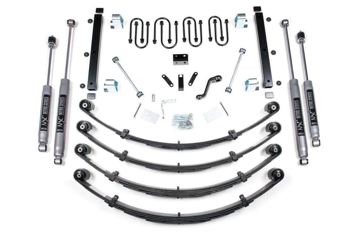 BDS Suspension has designed this 3.5-inch lift kit for the 1987–1995 Jeep Wrangler YJ to improve stance, performance, and capability. The kit provides clearance for up to 33-inch tires and includes everything necessary for a complete installation. Front and rear Glide-Ride leaf springs are paired with new U-bolts, front and rear track bar relocation brackets, brake line brackets, a power steering pitman arm, bump stop extensions, and a transfer case drop kit to ease driveline angles. The kit is rounded out with NX2 Nitro Series gas shocks tuned specifically for this application.