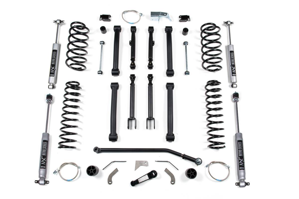 BDS Suspension's 4.5-inch suspension lift kit is designed to improve the stance and capability of the 1997–2006 Jeep Wrangler TJ/LJ, providing clearance for up to 33-inch tires. The front kit includes BDS Pro-Ride coil springs, a heavy-duty adjustable front track bar to recenter the front axle, bump stop extensions, stainless braided brake lines, sway bar quick disconnects, and heavy-duty front upper adjustable and fixed-length lower control arms. The rear kit features Glide-Ride coil springs for maximum travel, a stainless braided brake line, a rear track bar relocation bracket, BDS ultimate sway bar disconnects for maximum articulation, and heavy-duty upper adjustable and fixed-length lower control arms. The kit is completed with your choice of specially tuned NX2 Nitro Series gas shocks or FOX 2.0 IFP Performance Series gas shocks.