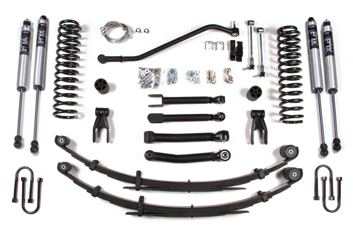 Configured for vehicles with the Chrysler 8.25 rear axle, this kit includes the correct u-bolts sized at 3 inches wide. Shocks included: FOX 2.0 Performance Series — featuring a 2-inch impact extruded aluminum body, internal floating piston (IFP) monotube design, CNC machined 6061-T6 aluminum mounting ends, massive 5/8-inch hard chrome plated heat-treated alloy steel shaft, race-developed high-flow piston, application-specific valving, and a long-lasting clear anodized finish.