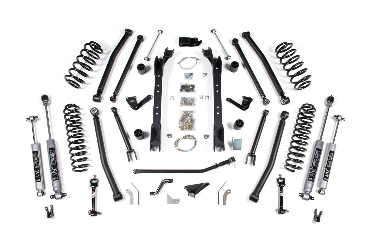 A slip yoke eliminator kit and CV-style rear driveshaft are required. May require exhaust modification. Some welding required. Long arm systems also fit short wheelbase Rubicon models (not Unlimited models).