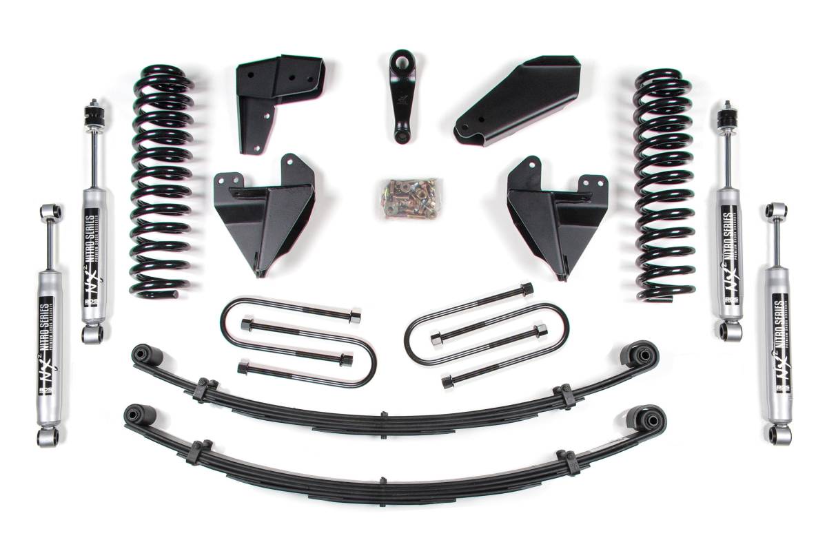 This 6-inch suspension lift kit by BDS is designed for 1980–1983 Ford F100 and 1980–1996 Ford F150 4WD trucks. The kit is engineered to improve stance, performance, and capability, providing clearance for up to 35-inch tires. Up front, the kit includes Pro-Ride coil springs, axle pivot relocation brackets, radius arm drop brackets, a forged pitman arm for steering correction, and precision-tuned NX2 Nitro nitrogen-charged shocks. The rear configuration varies by selected variant and is paired with a matching set of NX2 Nitro shocks.