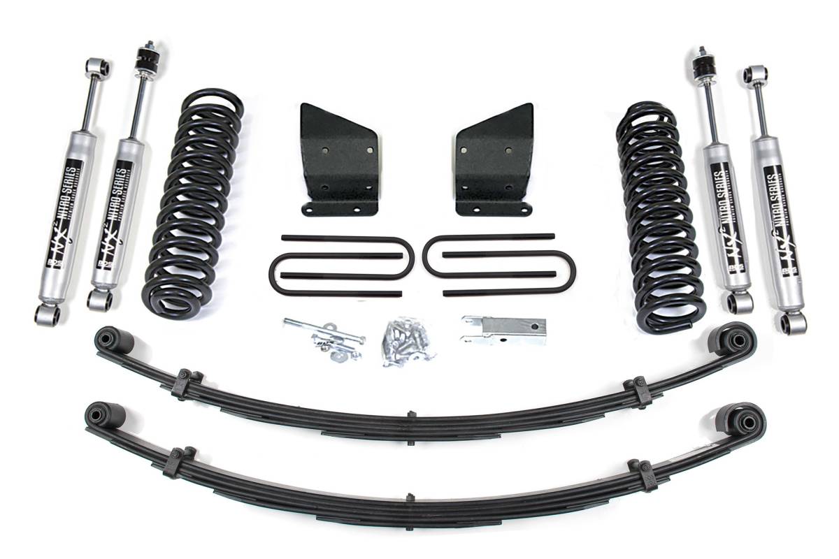 This 6-inch suspension lift kit by BDS is designed for 1978–1979 Ford Bronco 4WD trucks. The kit improves stance, performance, and capability while providing clearance for up to 35-inch tires. Up front, the kit includes Pro-Ride coil springs, radius arm drop brackets, a track bar relocation bracket for steering correction, bump stop brackets, and precision-tuned NX2 nitrogen-charged shocks. The rear utilizes either a high-strength lift block with longer U-bolts or an add-a-leaf configuration (depending on selected variant), along with a matching set of NX2 Nitro shocks.