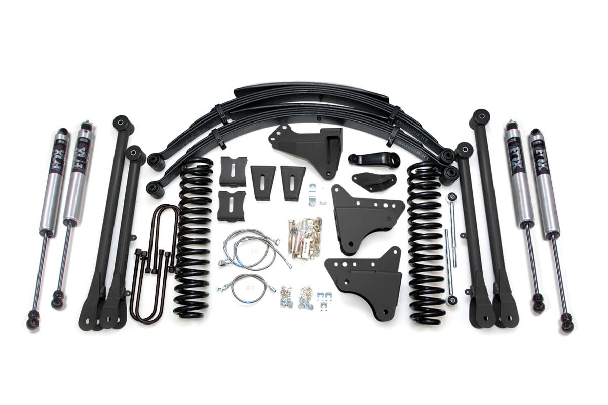 This 8-inch lift kit with 4-Link is designed for 2005–2007 Ford F250/F350 Super Duty 4WD gas trucks. The Glideride leaf spring system uses a dual-rate design: the primary three leafs remain active under no load for everyday ride quality, secondary leafs engage under moderate loads, and a bottom overload spring activates at full payload capacity. This arrangement allows the truck to maintain ride quality when unloaded without sacrificing hauling capacity.