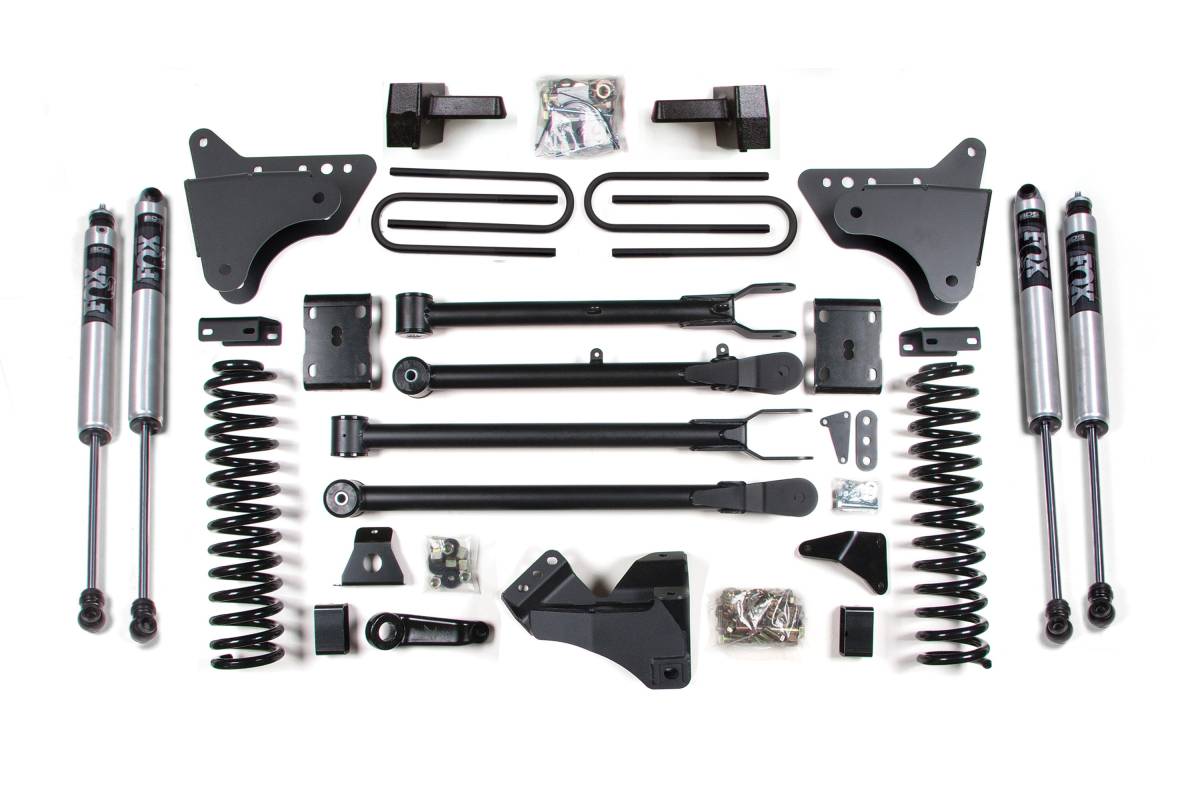 This 4-inch lift kit with 4-Link conversion from BDS Suspension is designed for 2011–2016 Ford F250 and F350 Super Duty diesel-powered trucks. The kit improves stance, performance, and capability while providing clearance for up to 35-inch tires. Up front, the kit includes diesel-specific Pro-Ride coil springs, 4-link control arms with conversion brackets, a forged drop pitman arm, a track bar bracket for steering correction, sway bar relocation, brake line brackets, and precision-tuned nitrogen-charged shocks. In the rear, the kit features a high-strength fabricated lift block or leaf spring option, a u-bolt flip kit for maximum clearance, brake line brackets, and a matched set of shocks.