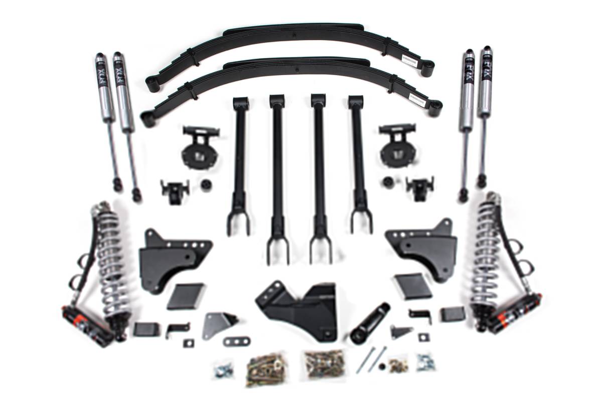 This 6 inch lift kit with 4-Link and FOX 2.5 Performance Elite Coil-Over Conversion is designed for 2011–2016 Ford F250/F350 Super Duty 4WD Diesel trucks. The rear lift system retains the factory rear blocks and adds new BDS leaf springs to achieve a level stance. The leaf spring design operates in three stages: the primary three leafs function with no additional load for everyday ride quality; secondary leafs engage under moderate loads; and a bottom overload is engaged when the truck is fully loaded for maximum hauling capacity. This progressive setup maintains ride quality when unloaded without sacrificing payload capacity.